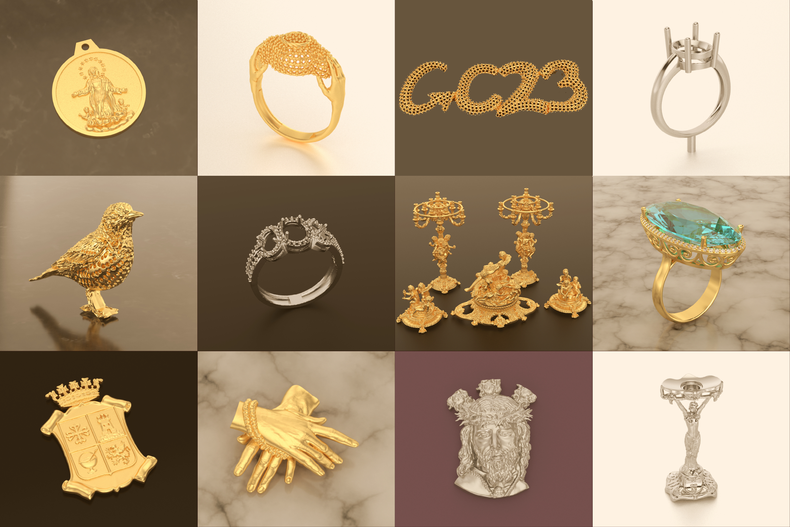 Tenemos una amplia experiencia en joyería comercial. Nos adaptamos a las distintas características que requieren este tipo de piezas, para evitar problemas en la producción en masa, y cuyo acabado sea competitivo y de calidad. En cuanto a las joya de autor, diseñamos piezas únicas, con inspiración, creatividad y con cualquier tipo de complejidad. Diseñamos modelos para engaste en cera, con la mayor precisión. También diseñamos en 3D pins, insignias , joyería artística y religiosa.